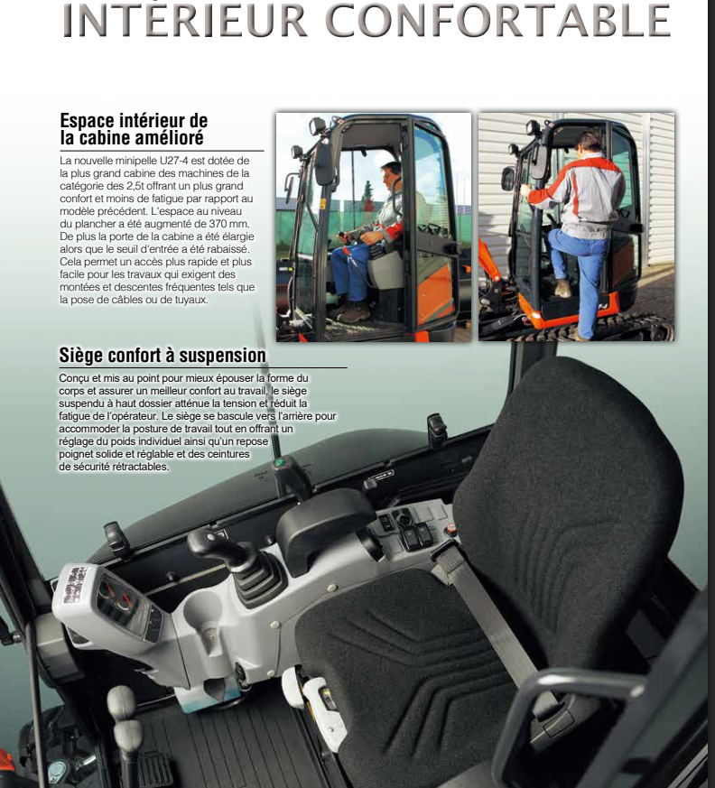 La U27-4 est dotée d’un siège à suspension qui vous permet de travailler confortablement, ainsi que des leviers de commande de pilotage hydrauliques avec repose-poignets pour une utilisation sans effort.