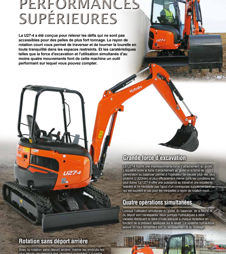 Le déport arrière zéro de Kubota offre une excellente stabilité, ainsi qu’un contrôle et un fonctionnement en douceur dans les espaces confinés – sans avoir besoin de contrepoids supplémentaires.