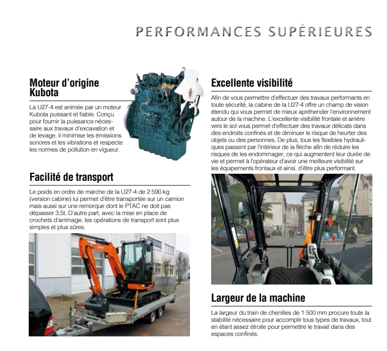 La U27-4 est une machine compacte qui ne souffre aucun compromis en termes d’espace. Elle est dotée de la plus grande cabine de sa catégorie, avec un accès large et facile par le bas, une visibilité étendue et un espace opérateur ergonomique.