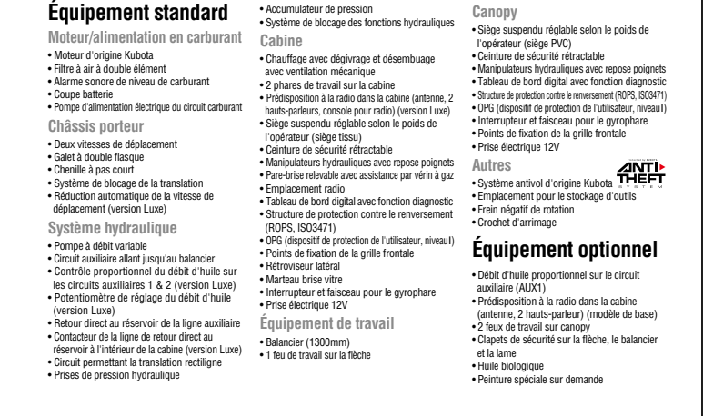 Les caractéristiques de sécurité intégrées comprennent un frein négatif qui bloque automatiquement la fonction de rotation et des points d’arrimage sur le châssis supérieur pour un transport plus sûr.
